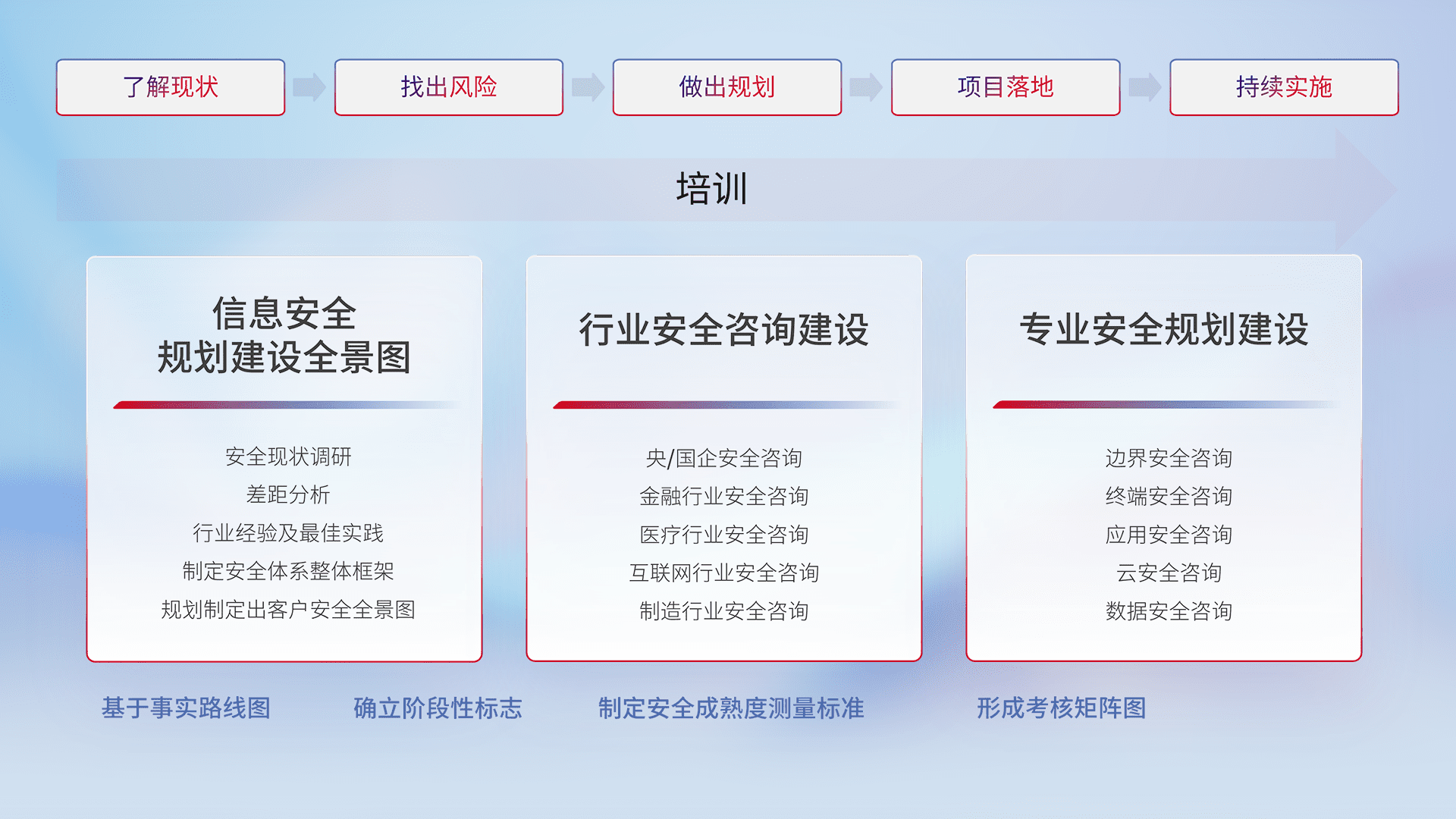 梳理客户信息安全现状调研、、差距分析结果,,,,结合行业先进经验及最佳实践,,,,制订客户的信息安全管控体系总结架构,,,最终形成一个完整的客户信息安全规划与建设的全景图。。。