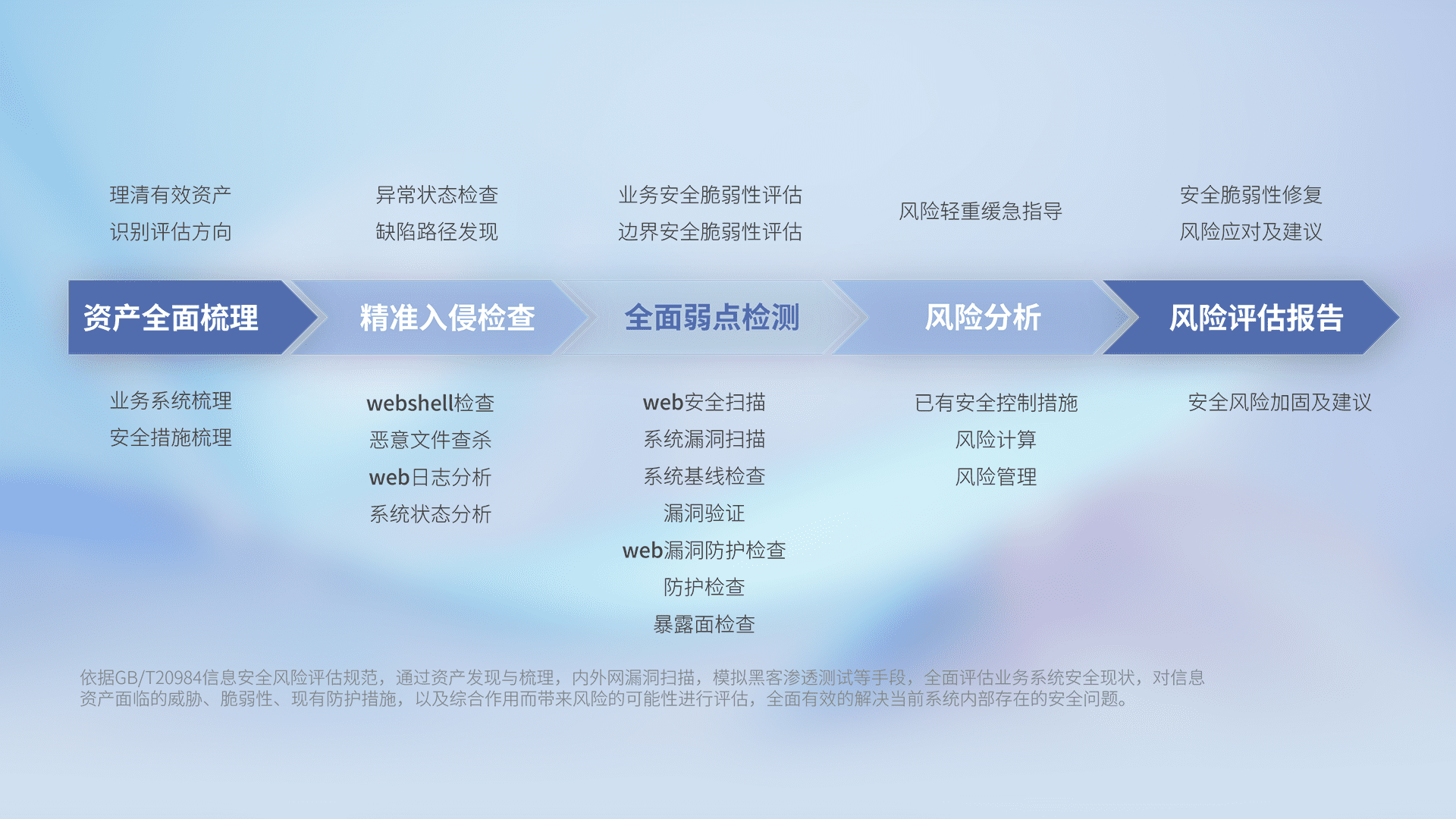 针对客户行业特性,,,,以专业的安全服务+多厂商联合解决方案提供专属的一站式安全管理服务,,帮助客户全面感知网络空间威胁,,,,基于识别、、、、检测、、分析、、、、防护、、、监测、、响应的服务理论模型,,,,从方案咨询、、、集成交付、、、、评估验证、、、、优化加固、、、、运维运营,,,致力于为客户提供完整的闭环管理式安全服务。。。以实战经验为客户打造高抵御风险的安全体系,,,,帮助客户发现威胁、、对抗威胁、、、、处置威胁,,,不断积累安全对抗能力,,,持续保障数字化安全。。。